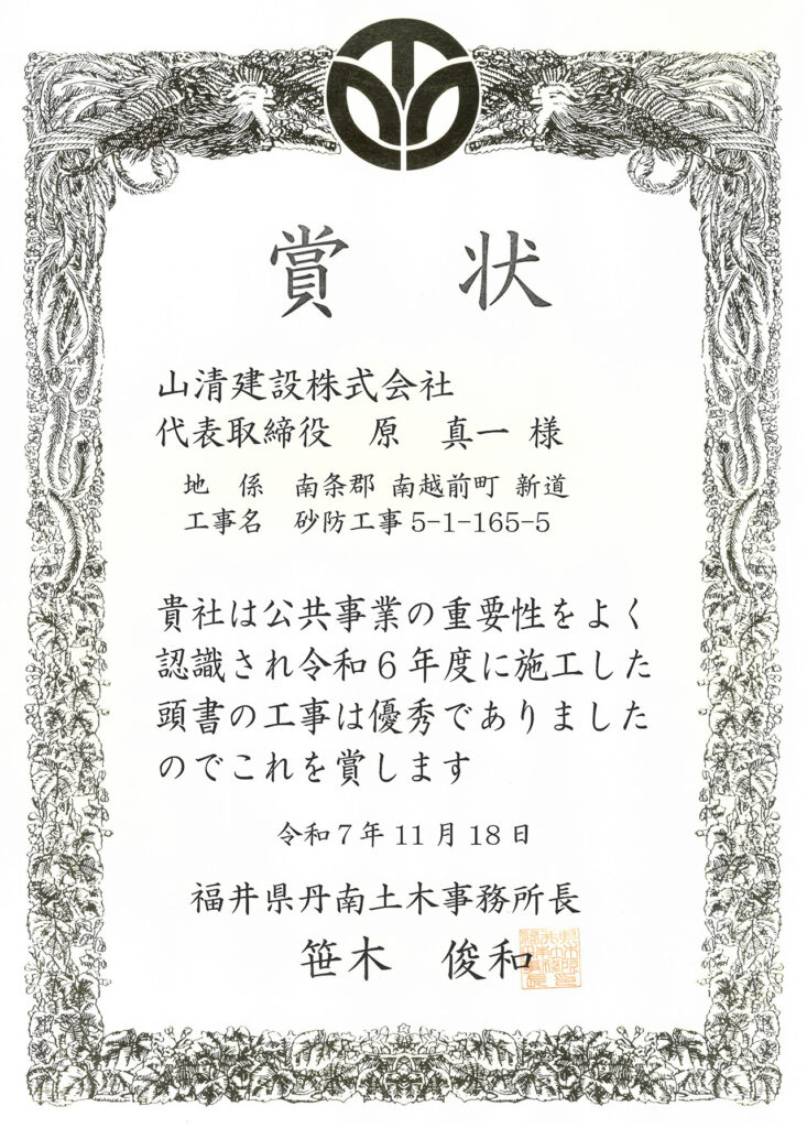 令和7年11月18日、令和6年度に施工した「南条郡南越前町新道の砂防工事」が優秀であったことが表彰されました。